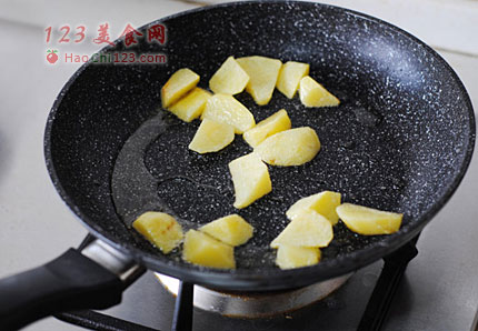 3、准备配菜,土豆去皮切成块,平底锅加油烧热,放入土豆小火煎至两面金黄色。