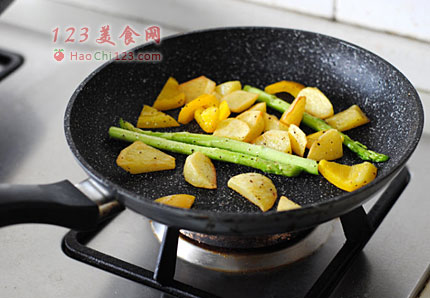 4、土豆块煎至差不多的时候,放入洗净的芦笋和黄甜椒块翻炒至断生,撒少许盐和黑胡椒翻炒均匀即可出锅。