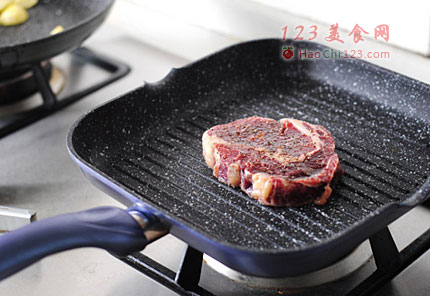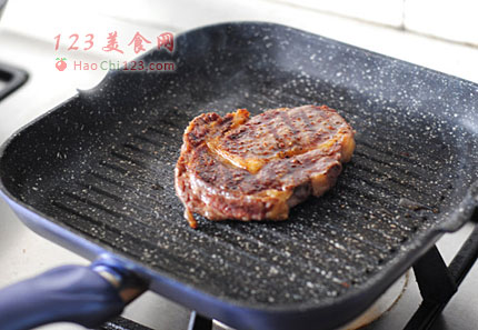 5、牛排锅烧热,一定要烧热哦,放入牛排不要动,大约一分钟后将牛排旋转70度,再煎一分多钟后翻面。