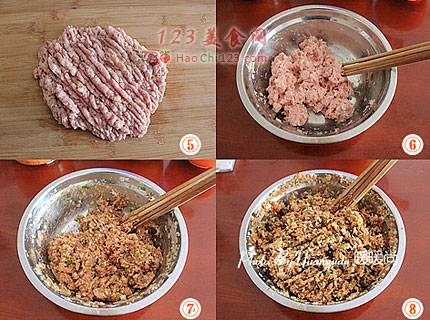 5、猪肉提前用冷水浸泡去除血水,然后控水、去皮剁成肉馅。