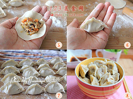 5、6、包入适量的饺子馅,先将中间捏紧,再用两手将两边往中间挤,同时两个大拇指和食指用力将两边的边边捏紧即成。