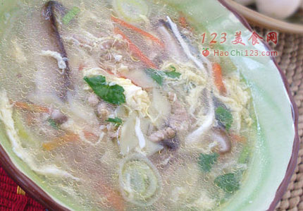 9、出锅后撒上少许葱花,加些香菜段,这样一碗色香味俱全的香菇肉丝珍珠琪就大功告成了。