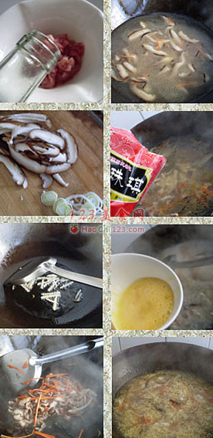 2、香菇洗净去蒂,切成丝。胡萝卜切细丝,鸡蛋打散成蛋液备用。