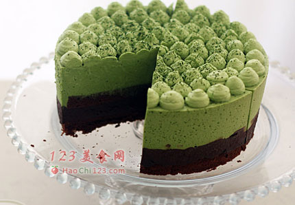 21、脱模后,在鲜奶油中加入抹茶粉和细砂糖打至8分发,用圆形裱花嘴,在蛋糕表面挤上圆形小球,最后在上面筛上些抹茶粉即可。