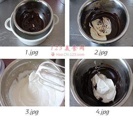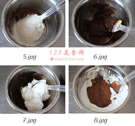 4、在巧克力酱里切拌入三分之一的蛋白霜。