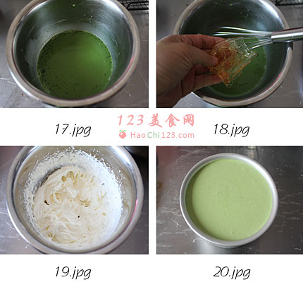 18、吉利丁片用冰水泡开,加入牛奶抹茶液里,搅拌至吉利丁融化。