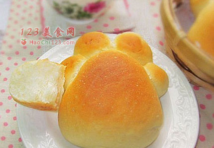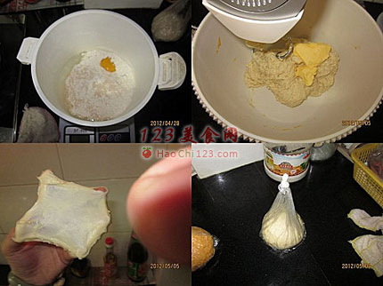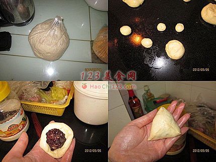 4、将松驰好的面团滚圆,分成一大,二稍大,二小的小面团,大面团压扁,包上适量的红豆馅,包上口(像包三角包一样包口,这样出来的脚印形状就很像了),放进烤盘里,二稍大和二小的面团揉圆,二稍大的放中间,二小的放两边,这样,一个完整的小脚印(大脚印)就做好了(看不懂文字说明的直接看图说明哈)。