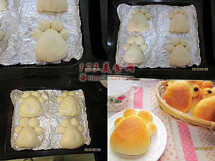 5、做好的小脚印放烤盘里再次发酵至2倍大,看看,挤太满,悲剧了,烤箱170度预热,中层上下火12分钟即可。