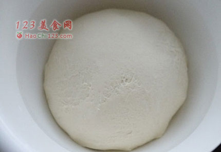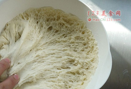 6、拉起面团内有大量气孔发酵完成。面团我是早上上班前揉好的,中午回了趟家根据面团发酵程度再做处理。如果和我一样是上班族可以早上揉好后发一会,然后盖保鲜膜冰箱慢慢发。等晚上下班回来,取出回温继续发就OK了,这样馅料处理好后面团也就差不多了。根据时间自行调整吧。