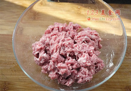 2、面团发酵的过程中来制做馅料,颈背肉洗净冰箱稍微冻一下有一点点硬度,这样才更好切,先竖切片再改为切丝,再切成丁。然后开始剁,先横剁再竖剁。横竖剁几遍,然后四周用刀掀起分别盖上中央,再横剁、竖剁直到肉馅较细腻。当然可以用胶肉机来胶省却了这一步。个人认为手剁馅更好吃,有时间的话就手工操作吧。剁好的肉馅放入大碗中。