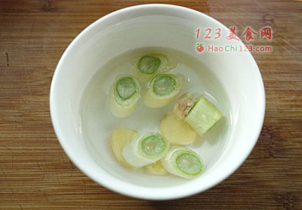 3、葱姜水将葱小段、姜片一起入碗,加入清水浸泡20分钟,取出葱丝、姜片,用纱布过滤,挤出余汁入碗,碗中的汁水即葱姜水。在开始剁肉前就泡上,肉剁好就可以直接用了。