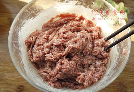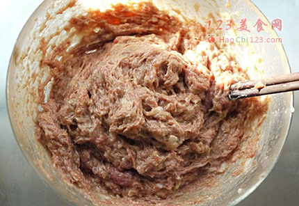 4、肉馅朝一个方向一边搅打一边加入葱姜水,每次都至完全吸收再加入下一次葱姜水。这一步不可少啊,这是保证肉馅湿润,成品有少许汤汁的关键。没有仔细称量多少克但这半碗我全都打进了肉馅又加了一点点。搅打的时候也要记得一个方向,这样肉馅才能上劲好吃。