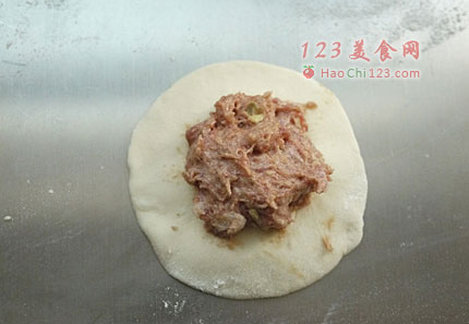 8、擀成中间稍厚,边缘稍薄的面皮。中间加入馅料,左手托着,右手一个褶压一个褶向前擀,最后收口,包包子是熟练工多练几回就成了。