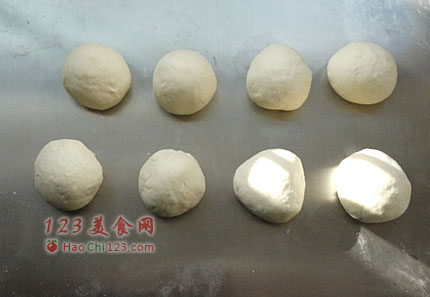 7、揉匀排气,滚成大面团静置十分钟。分成大约三十克一个的小剂子。
