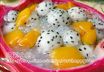 6、加入芒果粒,加入西米、糖水或椰汁即可。