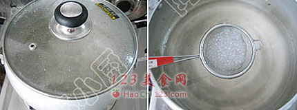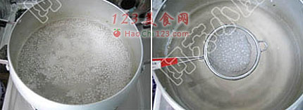 3、再入沸水中煮至透明后,捞起过第二次冷河,才能让西米成为晶莹剔透、口感Q滑的西米露。