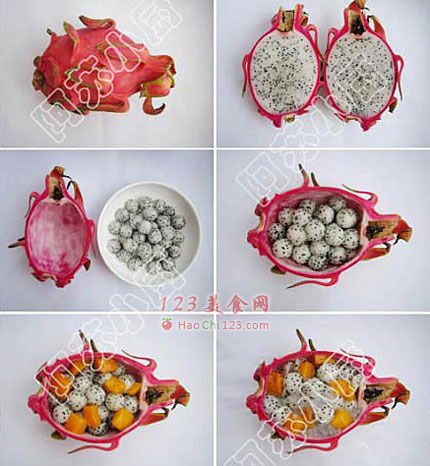 4、火龙果对半切开,用挖勺挖出果肉,保持果皮完整。