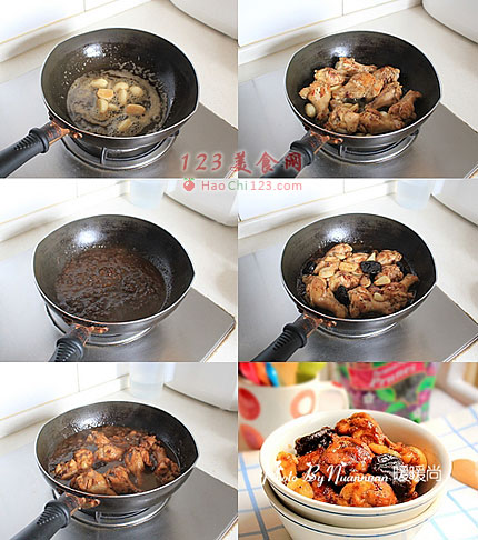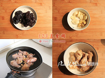 8、放入煎好的鸡翅根、蒜瓣和西梅。