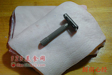 2、肉洗净后,要特别处理一下肉皮上的油泥和猪毛。