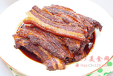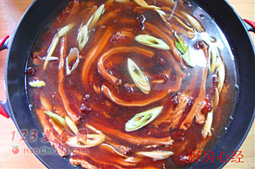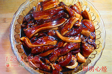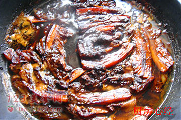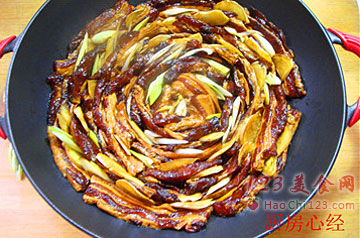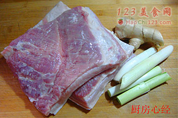 5、用一只铸铁锅,一层肉片,一层葱姜的码制。码好的肉片造型。