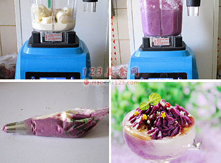 10、将山药泥和紫薯泥挤入容器中,上面浇上蜂蜜即可。