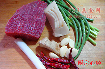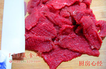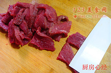 3、牛肉一定要顶刀垂直于纤维的方向切断肉纤维,大约2-3毫米的厚度。肉片不能切得太薄,藏不住水分,牛肉就容易发干,变柴。