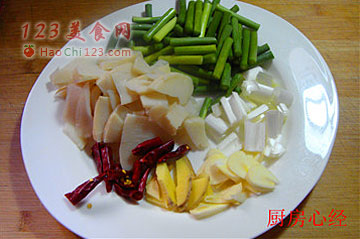 8、锅中做开水,水开后关火下入肉片,变色后捞出。放在水龙头下面,将肉片冲洗干净,控水备用。