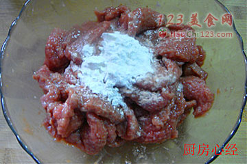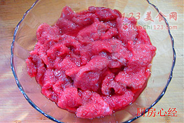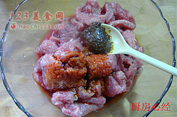 6、然后再用清水冲洗干净“松肉粉”,使肉片爆出清爽的感觉。下一步给肉片上浆:沙茶酱、酱油、清水抓匀。清水要加足,保证肉片软嫩的关键。