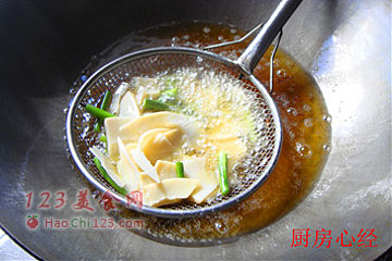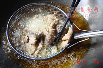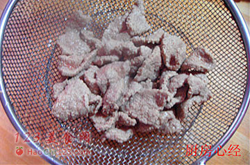 9、控净水的肉片,还要下入4成热的油锅,冲炸一下。快速捞出,目的是增加牛肉的口感。