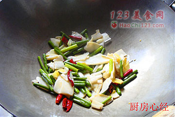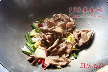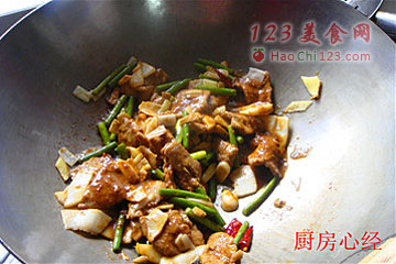 14、迅速烹入碗汁,迅速炒匀即可出锅。