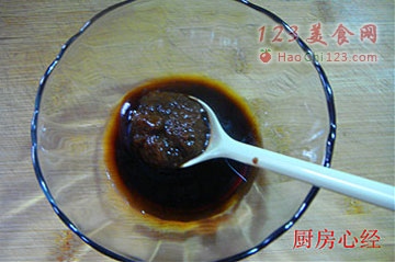 13、提前调好一个碗汁:酱油、料酒、沙茶酱、芝麻酱、耗油、淀粉。
