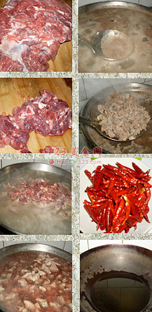 8、倒入牛肉粒煸炒均匀,煸炒大概五分钟左右,然后倒入炸好的辣椒炒匀