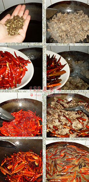 7、将辣椒倒入锅中,煸炒至辣椒变成暗红色捞出