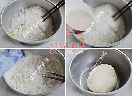 3、再分次倒入牛奶,将面粉搅拌成雪花状。