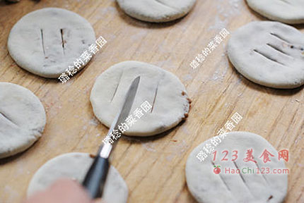 8、再用擀面杖轻轻擀薄一些,用刀子在表面划两、三道,划穿面皮(目的是受热后内部热气容易释放)。