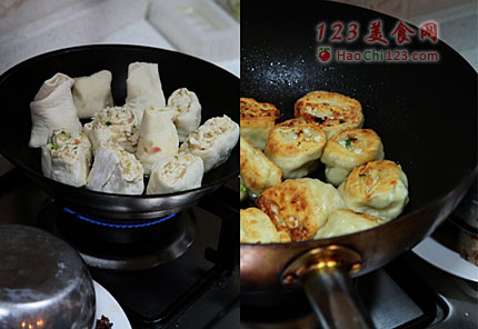 7、加入少许油,稍煎一会,观察卷子里层面熟了,就可以起锅老。