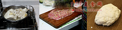 2、馅:豆腐切成小丁,加入香葱、剁椒、肉末(是自己剁的妈妈说这样剁出来的肉馅有劲道)盐、黄酒拌匀。