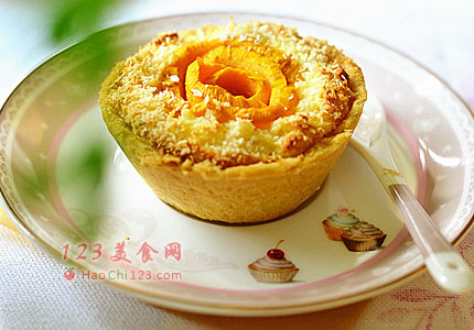 11、烤好的挞皮,先放一勺内馅,中间压个凹形,将切片的芒果排成小花放在中间,边上再放好内馅。