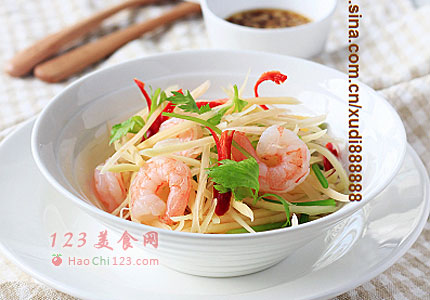 2、虾仁入沸水焯熟,入冰水浸凉后捞出。