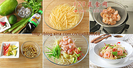 4、蒜头切末,辣椒切碎,加入鱼露、糖、柠檬汁一起调成料汁。