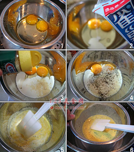 12、立刻摇晃平底锅,拌匀,蛋液变白即表示乳化完成。盛出后可撒些黑胡椒碎和奶酪粉。