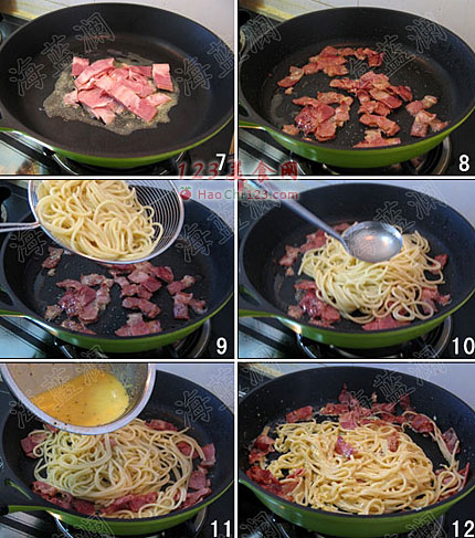 8、仔细拌炒培根,此时产生很浓的香气,将培根炒至表面酥脆中间柔软,关火。