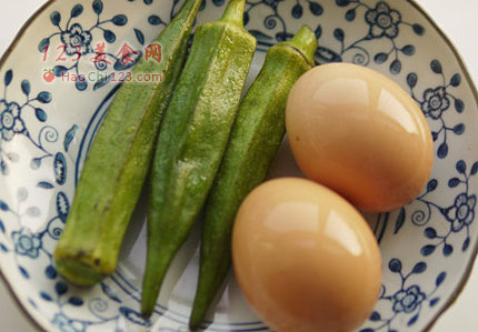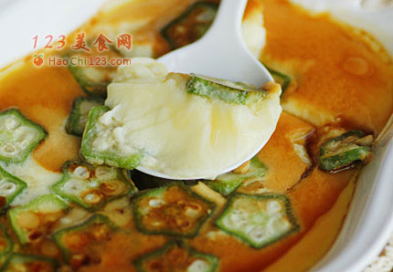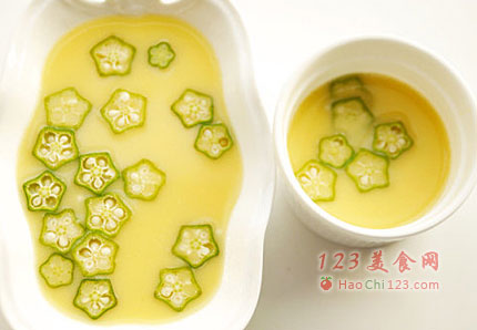 4、表面放切成片状的秋葵,并加盖保鲜膜或盖上盖子。