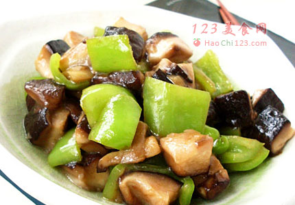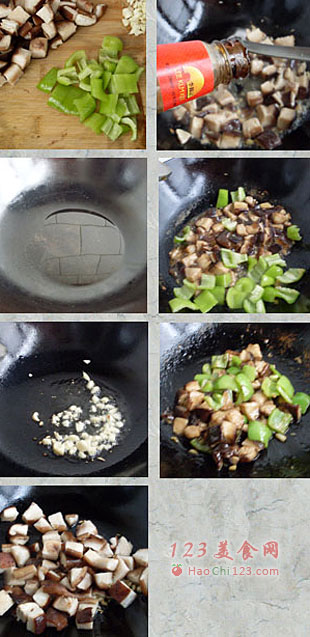 3、倒入香菇翻炒,炒至香菇变软出水的时候放入一大勺的耗油,翻炒均匀,然后放入辣椒丁翻炒。