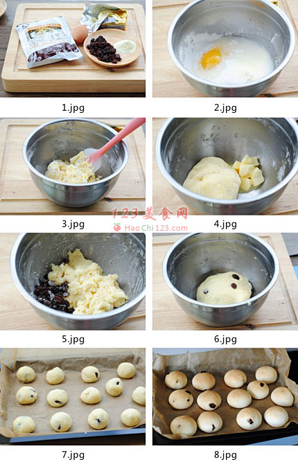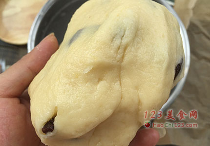 5、继续用手抓拌揉和,待黄油差不多被揉入时加入拌了干粉的提子干。