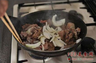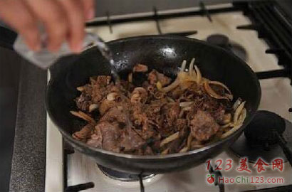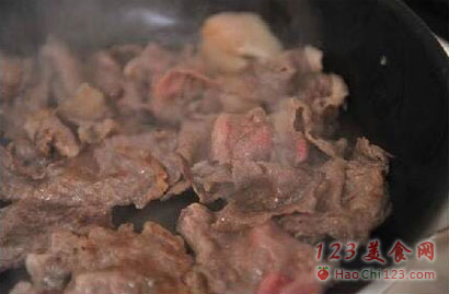 3、先用牛油热一下锅,然后加入肥牛,大火炒,炒成快熟没熟时,就是这个样子的时候。