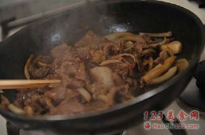 6、继续翻炒,要有汁水(盖饭必备),然后加入料酒,中火煮5分钟.
