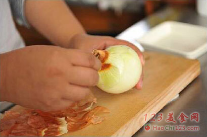 4、加入洋葱,然后加入少许白酒、盐、老抽,继续翻炒。