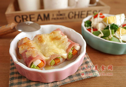 5、将包入蔬菜的火腿片卷起,用牙签固定,放入焗烤盘,再放入奶酪丝,放入已预热的烤箱,烤至表面融化即可。