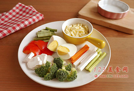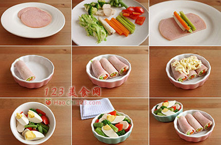 贴士:用刚才做火腿卷剩下的蔬菜,加上西兰花、红椒、扁豆、水煮蛋,所有蔬菜切好,汆烫,沥干,放入焗烤盘,加盐和黑胡椒拌匀,在蔬菜上挤上一些蛋黄酱,撒上一点奶酪丝,入烤箱同样烤到融化就好,也可以去掉焗烤的步骤,拌入蛋黄酱后直接食用。[sushi.laoyanhuo.com]